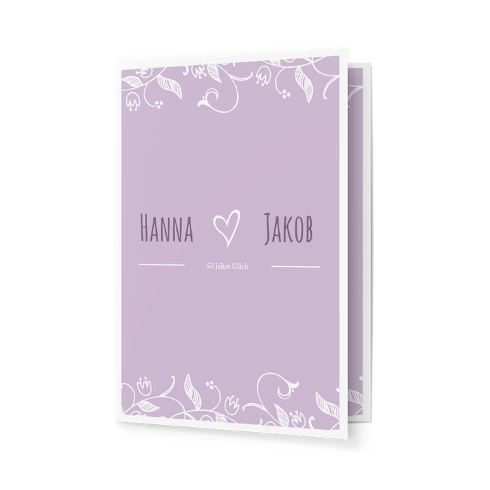 50 Jahre gemeinsamer Lebensweg liegen hinter Ihnen! Ein wahrer Grund zum Feiern. Die romantisch gestaltete Wunderkarte Blumenranke in Flieder bietet Ihnen einen geschmackvollen Rahmen, Ihre Liebsten zu diesem Fest einzuladen. Ergänzen Sie die Karte mit persönlichen Nachrichten und schönen Fotos. Da kommt die Familie gerne zusammen.
