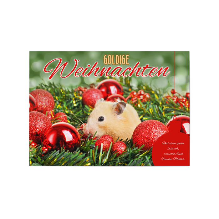 Unser Goldhamster in Rot wünscht frohe Weihnachten! Egal ob Sie selbst einen Hamster haben oder nicht, über diese Karte werden sich Ihre Lieben ganz sicher "tierisch" freuen! Eine lustige Idee zum Fest, die Kindern garantiert ganz besonders gefällt - frohe Weihnachten!