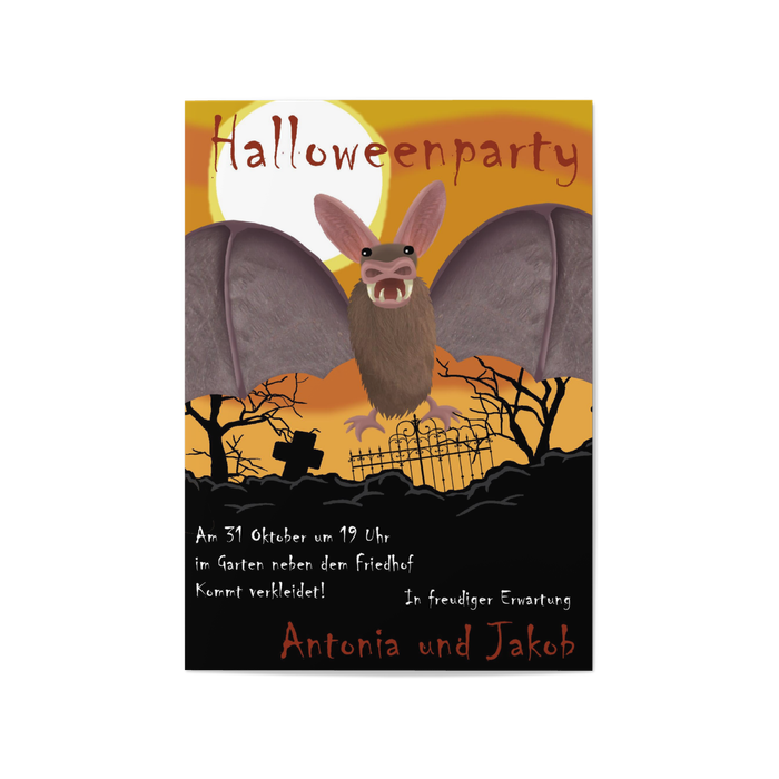 Einladungskarte „Fledermaus“ weist Ihren Gästen den richtigen Weg. Einzigartig, witzig und individuell ausgestaltet, flattert diese