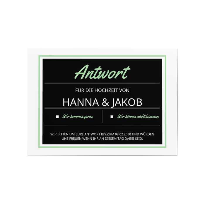 Sie möchten keine Überraschungen bei Ihrer Hochzeit erleben? Dann legen Sie die Antwortkarte Typografie in Grün Ihren Einladungen bei. Mit ihr haben Ihre Gäste die Möglichkeit, Ihnen ganz einfach mitzuteilen, ob sie an Ihrem wichtigen Tag dabei sein möchten.