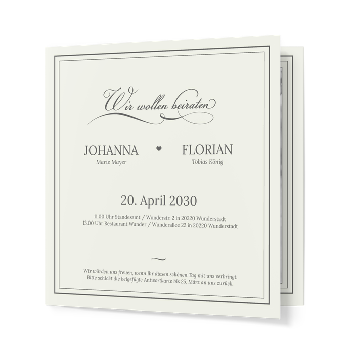 Sie heiraten? Für den schönsten Tag im Leben bedarf es einer ebenso besonderen Hochzeitseinladung für all Ihre Gäste. Diese hübsche Einladungskarte in beige ist, verziert mit Ihren Text und einem Bild des zu trauenden Paares, garantiert die richtige Wahl.