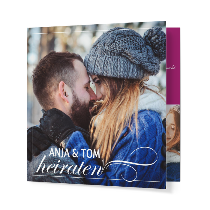 Die stilvolle und edle Hochzeitskarte mit Ornamenttypo in Lila. Die gesamte Vorderseite der Karte wird von einem Foto des Hochzeitspaares gefüllt - es bleibt also kein Zweifel, um wessen Tag es bei dieser Einladung geht. Sämtliche Texte und Bilder sind natürlich austauschbar.