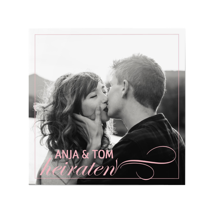 Ein großes Bild vom zukünftigen Hochzeitspaar ziert diese hübsche und dezente Karte. Der Schriftzug "Wir heiraten" mit geschwungenem Schnörkel und in zartem Rosa macht Ihre Einladung geradezu märchenhaft.