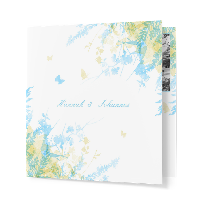 Schmetterlinge und Blumen ranken sich um den Namen des Brautpaares. Vervollständigen Sie die romantische Karte mit Ihren eigenen Fotos und kreieren Sie so Ihre ganz individuelle Hochzeitseinladung! Die Karte schafft eine verspielt-natürliche Atmosphäre und erhöht so die Vorfreude auf Ihre Hochzeit.