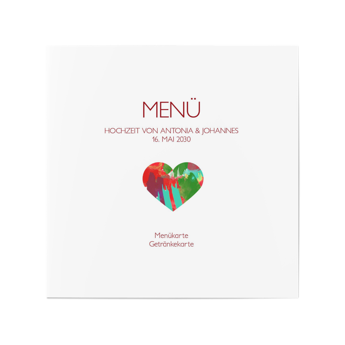 Ihre individuelle Menükarte in verträumter Wasserfarben-Optik und mit roter Schrift. Das schlichte Herzmotiv bildet den perfekten Blickfang für Ihr Hochzeitsmenü. Das schlichte Design verbindet Natürlichkeit, Romantik und zeitlose Eleganz. Beweisen Sie besonderen Geschmack mit Ihrer einzigartigen Menükarte!