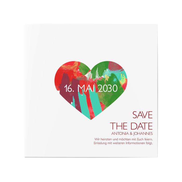 Save the Date! Dank dieser Karte mit Herzmotiv in Wasserfarben-Optik wird Ihr Hochzeitstermin Freunden und Familie mit Sicherheit im Gedächtnis bleiben. Auf Kitsch wird bei diesem Design ganz verzichtet, stattdessen wird zeitlose Romantik großgeschrieben. Ihre Gäste werden begeistert sein! In roter Schrift.