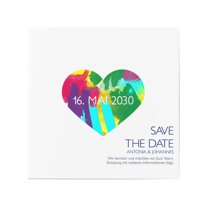Der perfekte Eyecatcher für Ihr Hochzeitsdatum! Bei dieser Karte im verträumt-romantischen Look sorgt ein schönes Herz in Wasserfarben-Optik dafür, dass der Tag Ihrer Hochzeit garantiert im Gedächtnis bleibt. Eine Hochzeitseinladung können Sie dann auch zu einem späteren Zeitpunkt noch verschicken.