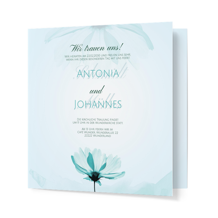 Die zarte Blume in Türkis auf dieser Hochzeiteinladung untermalt den Einladungstext in stilvoller Art. Aufgeklappt, wird der Betrachter mit einem Foto des zukünftigen Brautpaares überrascht.