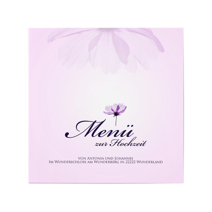In einem ansprechenden Lila ist diese Menükarte zur Hochzeit gestaltet. Den Gästen wird das Menü durch die elegante Gestaltung mit zarten Blumen vorab schmackhaft gemacht.