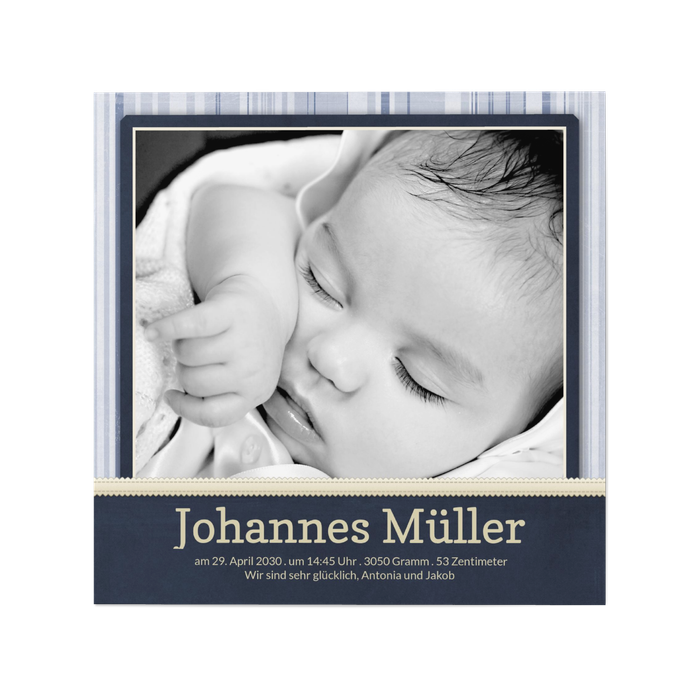 Nach langem Warten können Sie Ihren kleinen Schatz endlich in die Arme schließen und wollen Ihr Glück jetzt mit der ganzen Welt teilen! Zeigen Sie mit dieser Karte Ihren Freunden und Verwandten, wie schön Ihr Sohn doch ist. Auf dem großen Fotofeld können Sie das Bild perfekt platzieren, und den Namen auch noch gleich verraten.