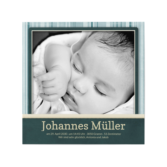 All das lange Warten hat sich gelohnt, wenn Sie ihren kleinen Sohn jetzt endlich in Ihren Armen halten können! Die ganze Welt soll jetzt Ihr Glück sehen können. Freunde und Verwandte lernen Ihren kleinen Schatz dank dieser Karte schon kennen, ehe sie ihn das erste Mal getroffen haben. Fügen Sie auf dem großen Fotofeld ein Bild des Kleinen hinzu und zeigen Sie Ihren ganzen Stolz.