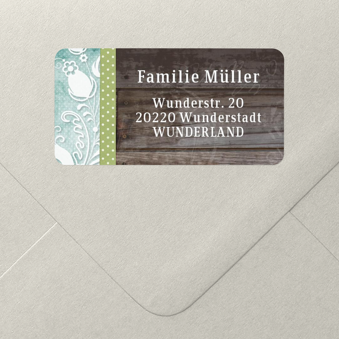 Wie auf Holz gepinselt fällt Ihr Name auf diesem Adressaufkleber jedem sofort ins Auge. Eine optische Aufwertung für jeden Briefumschlag! Die hübschen Blumenmuster auf dem hellblauen Hintergrund setzen einen süßen Farbakzent. Die Neugier auf den Inhalt ist Ihnen sicher!
