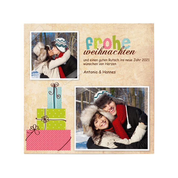 Diese farbenfrohe Karte sieht aus wie von Hand gemacht! Das lustige Design mit den Geschenkboxen und die verspielten Schrift verbreiten gute Laune an den Feiertagen. Verschönern Sie die Karte mit zwei Ihrer schönsten Fotos und versenden Sie Ihre ganz persönlichen Weihnachtsgrüße – Ihre Freunde und Verwandten werden begeistert sein!