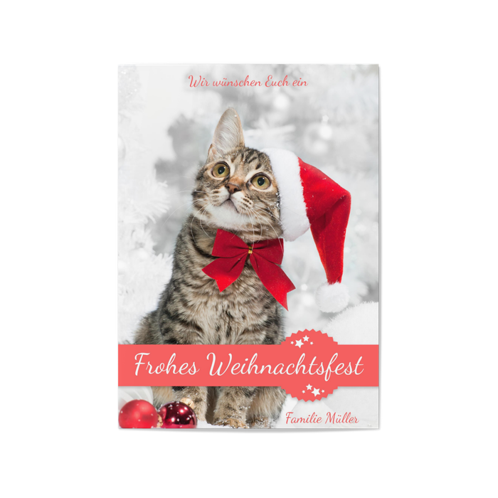 Miez Miez! Auch in Rot freut sich unsere kleine Weihnachtskatze schon "tierisch" auf das Fest! Wenn auch Sie Katzen lieben ist diese Karte die perfekte Wahl für Ihre diesjährigen Weihnachtsgrüße. Ihre Lieben werden begeistert sein! Frohes Fest!