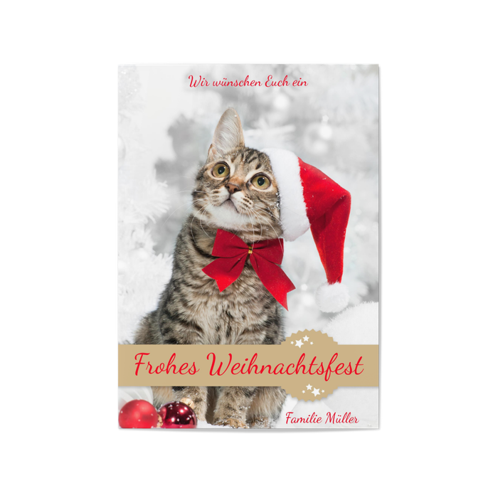 Frohes Fest wünscht unsere kleine Weihnachtskatze! Über diese originelle und witzige Karte werden sich Ihre Lieben garantiert "tierisch" freuen. Wenn Sie dieses Jahr einen etwas anderen Weihnachtsgruß versenden wollen, ist dies die perfekte Karte. Fröhliche Weihnachten!