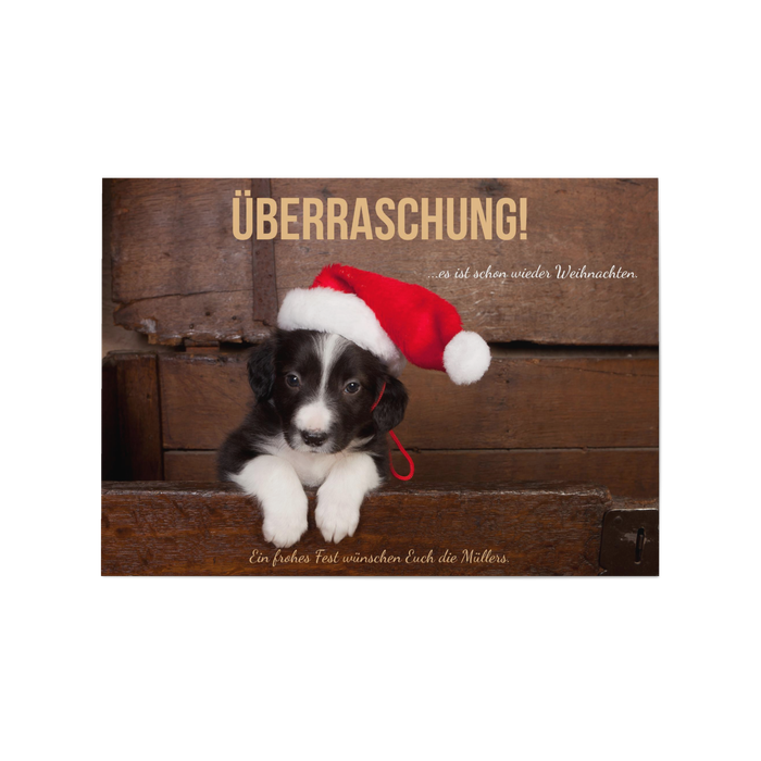 Ist er nicht süß, der kleine Weihnachtshund? Nicht nur für Tierfreunde und Hundeliebhaber eine besonders originelle Weihnachtskarte! Über diese "tierischen" Weihnachtsgrüße werden sich Ihre Freunde und Familie ganz sicher besonders freuen. Frohe Weihnachten!