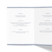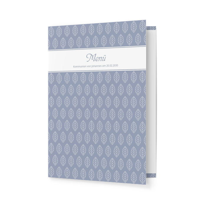 Ideal für Konfirmanten eignet sich diese Menükarte im passenden Stil zur Einladungskarte und Adressaufklebern. Weiße Blätter auf edlem Taubenblau weisen auf einen feierlichen, aber auch jugendlich fröhlichen Anlass hin und bestimmen den farblichen Rahmen Ihrer Konfirmationstafel – sowohl für Jungen als auch für Mädchen.