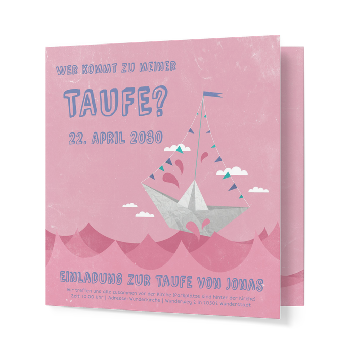 Ein kleines Papierboot in Rosa ist das Motiv dieser niedlichen Taufkarte. Die hohe Qualität dieser dreiseitigen Karte lässt es zu, dass jeweils die Vorder- und Rückseite (bis auf die letzte Seite) individuell bedruckt werden können. Neben Rosa ist die Karte auch in Grün und Blau erhältlich.