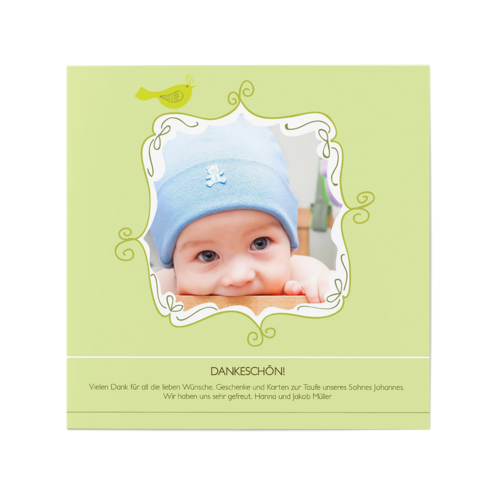 Verleihen Sie Ihrer Freude über die Geschenke und Glückwünsche Ihrer Freunde und Verwandten Ausdruck. Schicken Sie ihnen diese Dankeskarte, ausgestaltet mit hübschen Rahmen für das Foto Ihres Kindes und einem Vogel, der den Kopf des Rahmens ziert. Das frische Grün verleiht dieser Tauf-Karte zudem eine besondere Ausstrahlung.