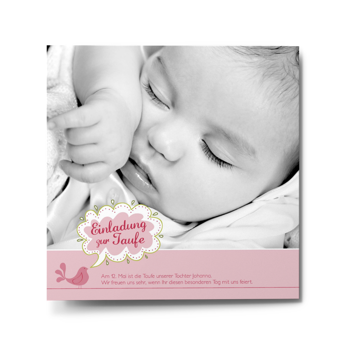 Ihre süße Tochter wird in die Gemeinschaft der Christen aufgenommen. Bald ist der große Tag, der Tag ihrer Taufe und natürlich darf dort niemand fehlen! Ein kleines Vögelchen in zartem Rosa verkündet allen Freunden und Verwandten, dass sie zu dem besonderen Ereignis eingeladen sind. Das große Foto Ihres Schatzes weckt die Freude auf das baldige Fest.