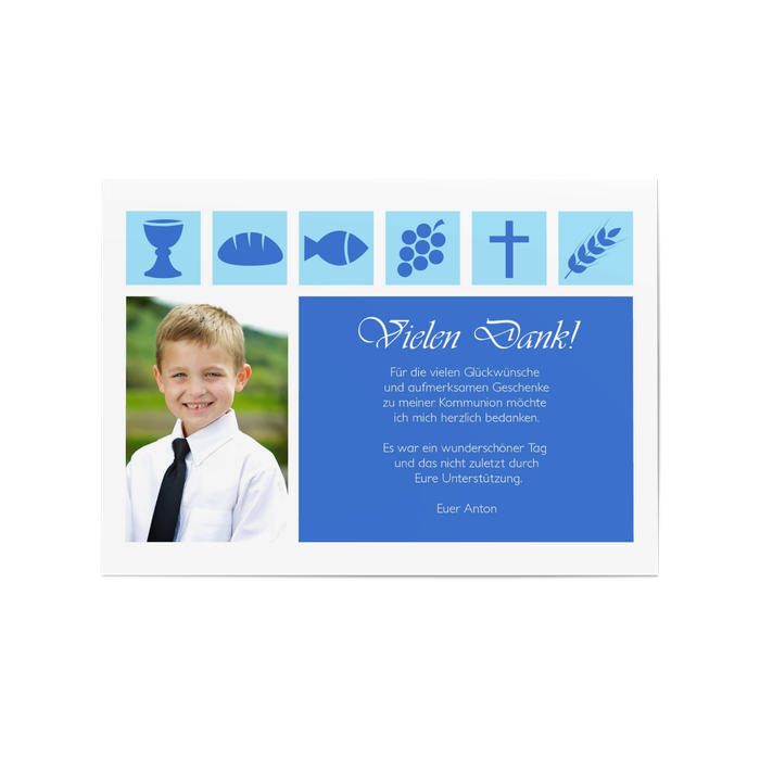 Der Christusfisch „Ichthys“, das heilige Kreuz, die Ähre oder der Kelch „ all das sind starke, christliche Symbole, deren öffentliche Verwendung als Glaubensbekenntnis sich seit der zweiten Hälfte des vergangenen Jahrhunderts wachsender Beliebtheit erfreut. Durch die Teilnahme an der Erstkommunion zeigen die Kommunionskinder zum ersten Mal auf eigenen Wunsch hin, dass Sie Christ sein „wollen“. Wenn der große Tag ein Erfolg war und Sie sich auf eine inhaltlich stimmige und wertschätzende Weise bedanken möchten, ist diese Danksagungskarte, die im Zeichen „Christlicher Symbole“ steht, das perfekte Mittel dazu.