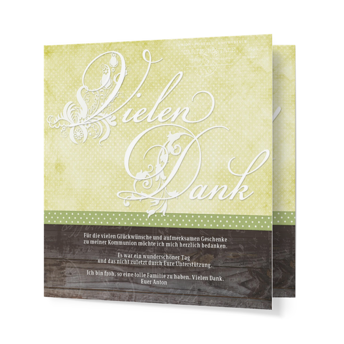 Geben Sie ein Stück Ihrer Freude zurück. Bedanken Sie sich bei Ihren Kommunionsgästen mit dieser außergewöhnlichen Karte! Sie bietet viel Platz für Ihre persönlichen Dankesworte. Schaffen Sie ein hübsches Erinnerungsstück an Ihren perfekten Tag.