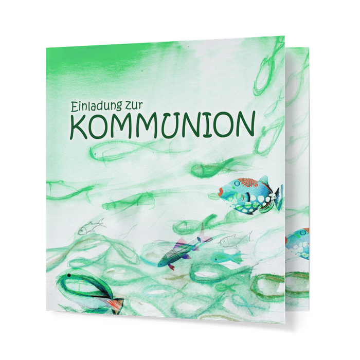 Das große Ereignis der 1. Heiligen Kommunion steht an. Laden Sie Ihre Familie und die Paten mit der außergewöhnlich gestalteten Wunderkarte Fische in Grün zu diesem Tag ein. Die farbenfrohe Karte ist mit Fischen bedruckt und bietet Platz für Bilder und persönliche Nachrichten.