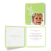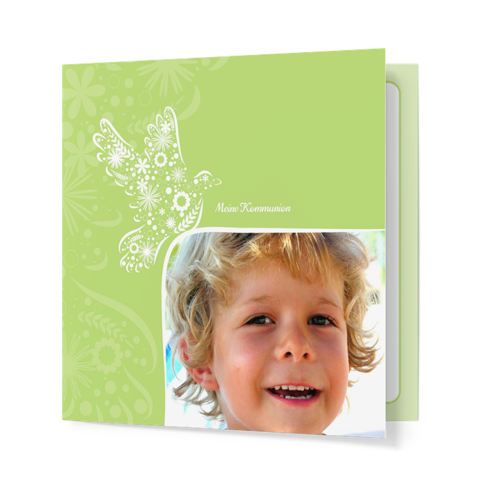 In dieser frischen und grasgrünen Einladungskarte wird Ihr Foto durch zierende Elemente geschmückt. Ein Täubchen aus Blumensymbolen und Ornamente im Hintergrund geben der Einladung zur Kommunion ihr glanzvolles Aussehen.