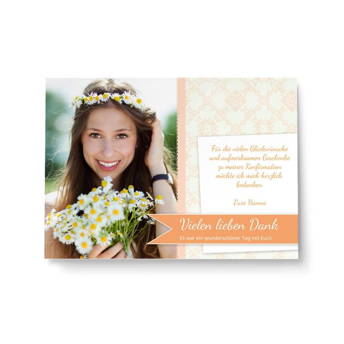 Frisch und modern präsentiert sich die Wunderkarte Banderole in Orange. Sie bietet den perfekten Rahmen für ein lieb gemeintes „Danke“ an alle Gäste, die mit Ihrer Tochter diesen Tag gefeiert haben. Fügen Sie rasch die schönsten Fotos des Tages sowie von Herzen kommende Grüße ein und schon haben Sie ein schönes Erinnerungsstück kreiert.