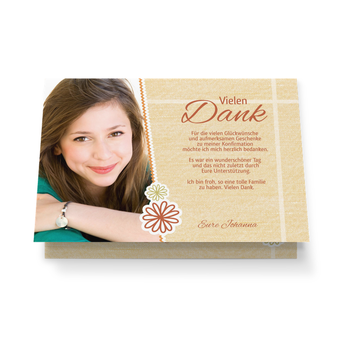 Schicken Sie allen Ihren lieben Konfirmations-Gästen mit dieser Wunderkarte ein "blumiges Dankeschön". In einem zarten Orange und mit kleinen floralen Symbolen geschmückt, wird diese Karte garantiert den Empfänger verzaubern. Vor allem, wenn er Ihr persönliches Foto und Ihren persönlichen Text darauf entdeckt.