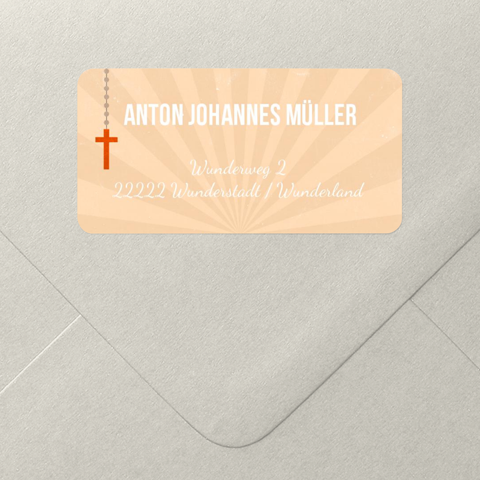 Ein kleines Kreuz ziert den wunderschönen Adressaufkleber Heilige Kette in Orange. Das Streifenmuster im Hintergrund erinnert an Sonnenstrahlen. Verwenden Sie den Aufkleber für die Einladungen oder Danksagungen zur Konfirmation oder Kommunion Ihres Kindes. Einfach himmlisch!