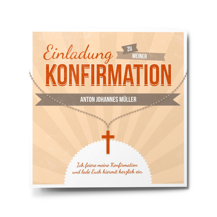 Diese Klappkarte wirkt besonders attraktiv durch ihr frisches Orange und das moderne Design. Auf der einen Seite jung, auf der anderen Seite, ganz dem feierlichen Anlass der Konfirmation entsprechend, traditionell mit einer heiligen Kette und einem Kreuz bestückt. Ihre Gäste werden beeindruckt sein.