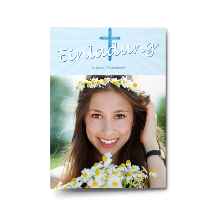 Diese Einladungskarte zur Konfirmation besticht durch ein wahrhaft himmlisches Blau, auf dem farblich abgestimmt ein heiliges Kreuz zu sehen ist. Ihre persönlichen Fotos und Ihre Texte werden auf dieser Wunderkarte in einem formvollendeten Rahmen präsentiert.