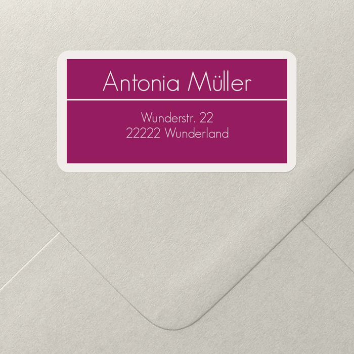 Leuchtend hell in einem fruchtigen Kirschfarbton ist dieser Adressaufkleber sicher ein Highlight auf jedem Briefumschlag. Teilen Sie gleich jedem schon vor dem Öffnen des Briefes mit, von wem er kommt. Durch den dezenten weißen Rahmen wird Ihr Name wunderbar hervorgehoben.