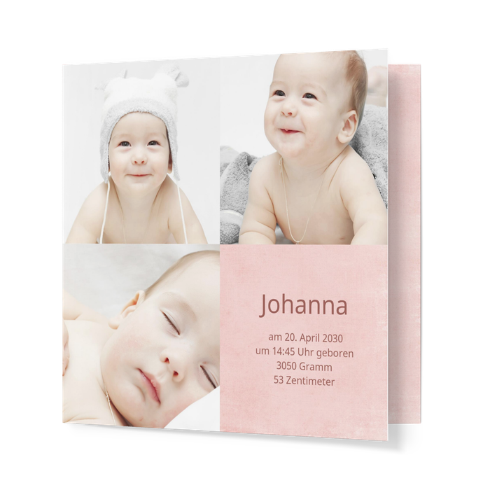 Endlich ist sie da! Jetzt können Sie Ihren kleinen Liebling in Ihren Armen halten und müssen Sie nicht wieder hergeben. Dieses Glück möchten sie natürlich mit all Ihren Lieben teilen. Ob Oma, Opa, Onkel und Tanten oder alle Freunde, jeder hätte gerne ein Bild Ihrer Kleinen. Hier stehen Ihnen gleich drei große Fotofelder zur Verfügung, und auch der Name und die Geburtsdaten Ihrer Tochter finden ihren Platz.