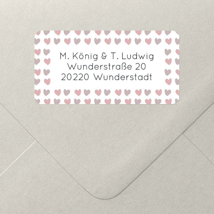 Mit zartem Rosa und dunklerem Brombeer umrahmen die kleinen Herzchen Ihren Namen und Anschrift. Der Empfänger Ihrer Post wird sicher neugierig sein, was dieser wichtige Brief enthält!