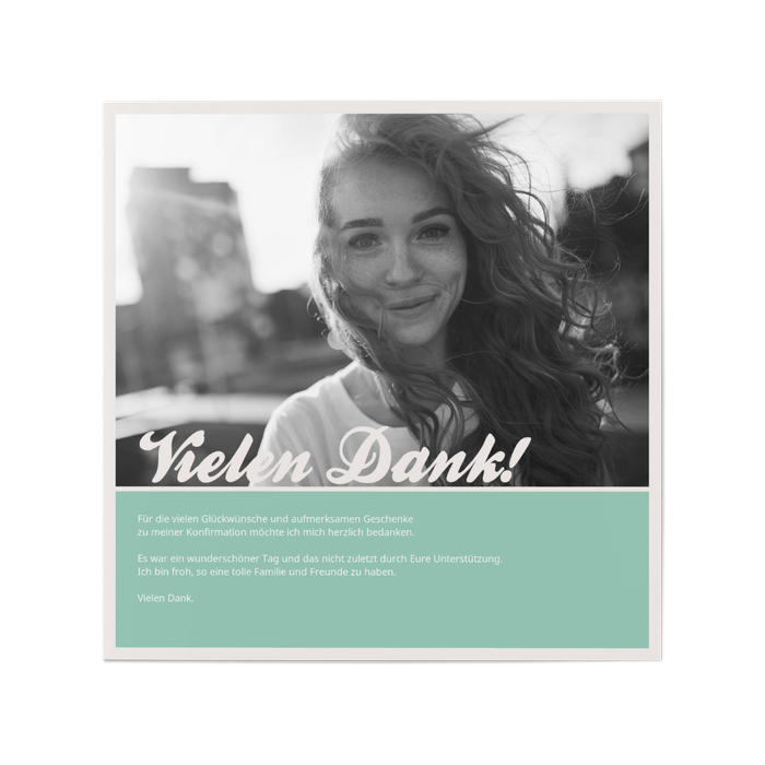 Dank all Ihrer Gäste war Ihre Konfirmation wirklich ein gelungenes Fest. Viele bedachten Sie mit lieben Worten oder gar aufmerksamen Geschenken, jetzt möchten Sie Ihnen „Vielen Dank!“ sagen. Ein sanftes Türkis bildet den perfekten Untergrund für Ihren persönlichen Dankestext, und auch für ein großes Foto findet sich noch genug Platz. Machen Sie nun allen Ihrerseits eine Freude, und schaffen Sie ein wunderbares Andenken an den großen Tag.