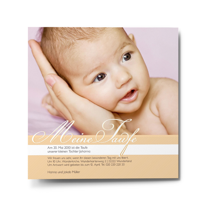 Bald steht ein großer Tag im Leben Ihres Kindes an: Die Taufe! Feiern Sie diese wichtige, christliche Zeremonie mit allen Freunden und Verwandten, und erleben Sie einen unvergesslichen Tag. Jeder weiß gleich, worum es sich handelt, sobald er die großen, geschwungenen Buchstaben sieht, die den Anlass des Festes bekannt geben. Dank einem Bild des Täuflings wird diese Karte zu etwas ganz persönlichem.