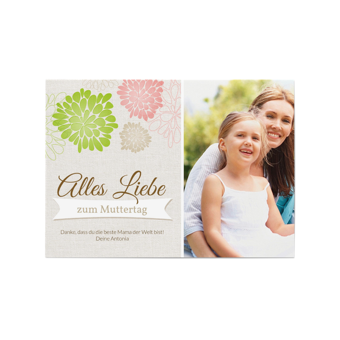 Muttertagskarte zeigen Sie Ihre Wertschätzung auf klassische Weise. Bei der Ausgestaltung der entsprechenden Text-und Fotofelder sind Ihnen kaum Grenzen gesetzt und durch das profesionelle Druckverfahren, erhalten Sie ein schön anzuschauendes und selbst gestaltetes Stück Erinnerung!