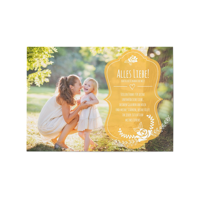 Muttertagsgruß in die großzügig angelegte Fotofläche. Tips für das richtige Format Ihres Wunschfotos gibt es auf unserer Webseite und vielleicht möchten Sie aus den verschiedenen Papiersorten wählen?