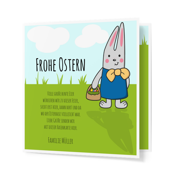 Die lustige Osterkarte mit Osterhase in Blau auf einer grünen Wiese. Die freundlichen Farben, das Blau des Himmels und das Grün der Wiese harmonieren sehr gut und steigern die Vorfreude auf die Überraschungen, die der Osterhase im Gepäck hat. Das Gedicht auf der Vorderseite kann dann durch persönliche Grußworte auf der Rückseite der Karte ergänzt werden.