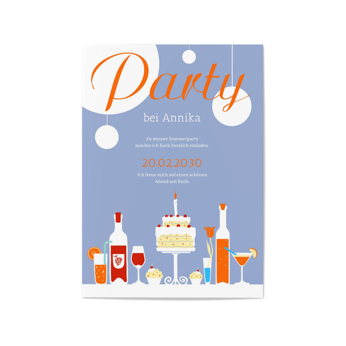 Diese bunte Partyeinladung besticht mit einem üppig beladenem Partytisch bzw. Partybuffet. Von Kerzen, leckeren Cocktails bis hin zur Torte fehlt es bei diesem Kartenmotiv hier an nichts – das perfekte Signal für Ihre Partygäste!