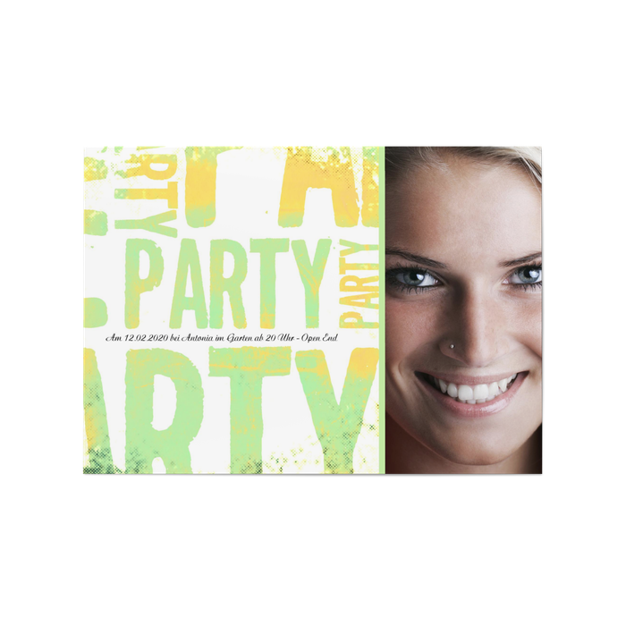 Gewöhnliche Partyeinladungen sind Ihnen zu langweilig. Diese Einladungskarte bietet Ihnen neben dem Schriftzug "Party" Platz für ein Foto von Ihnen. Nur noch Ort und Datum der Party angeben und schon kann die Party beginnen.