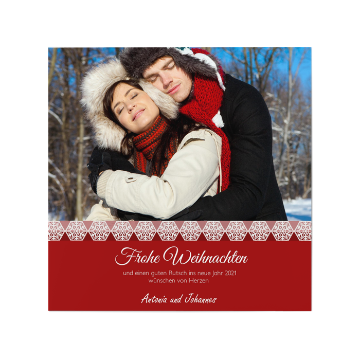Haben Sie einen Schnappschuss, den Sie unbedingt zu Weihnachten verschicken möchten? Dann nichts wie her damit. Denn mit dieser doppelseitigen Wunderkarte in einem satten Rot treffen Sie garantiert ins Schwarze – und mit Ihrem Weihnachtsgruß mitten ins Herz!