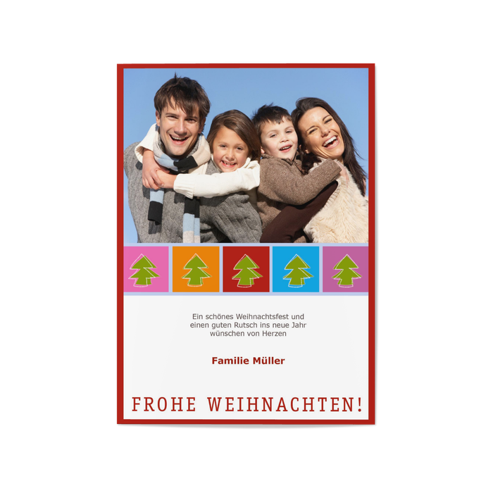 Die perfekte Karte für alle, die es auch zum Weihnachtsfest verspielt und farbenfroh lieben! Die bunten Tannenbäume sorgen für gute Stimmung – ihr persönliches Foto verleiht dieser Karte eine individuelle Note. Merry Christmas!