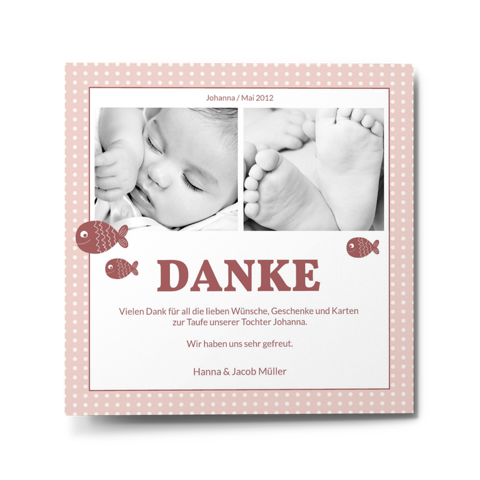 Die Taufe stellt einen der frühen Meilensteine im Leben Ihres Kindes dar. Mit dieser Karte im rosé-farbenen Pünktchen Motiv können Sie sich nun bei all jenen bedanken, die diesen Tag auf besondere Weise bereichert haben.
