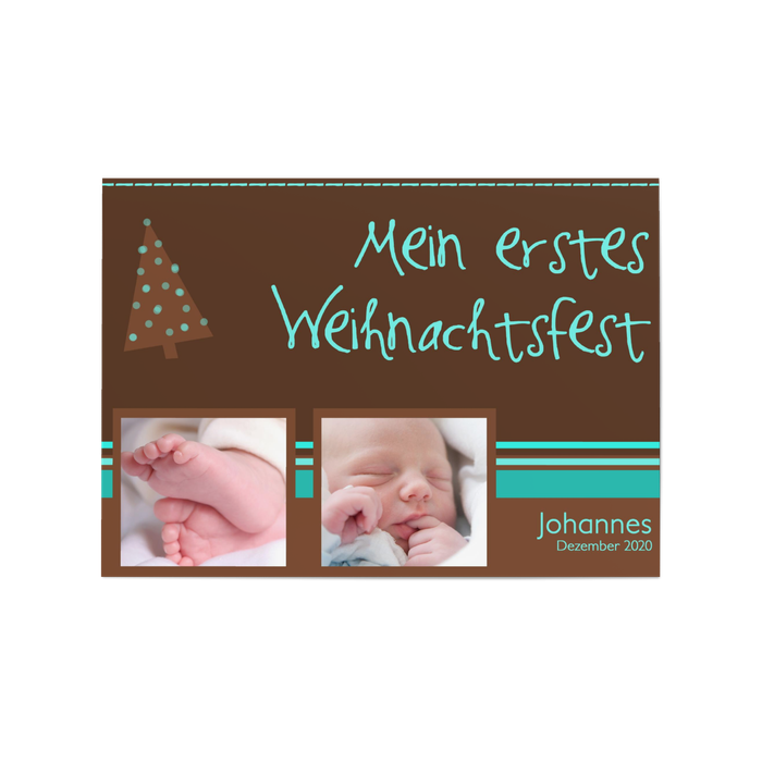 Weihnachten ist für Sie in diesem Jahr ein besonderes Ereignis, denn es ist das erste Weihnachten für Ihr Baby. Aufgrund dessen soll Ihr kleiner Schatz die Hauptrolle auf den Weihnachtskarten spielen. Türkisfarbene Streifen lenken die Blicke auf die Babybilder.