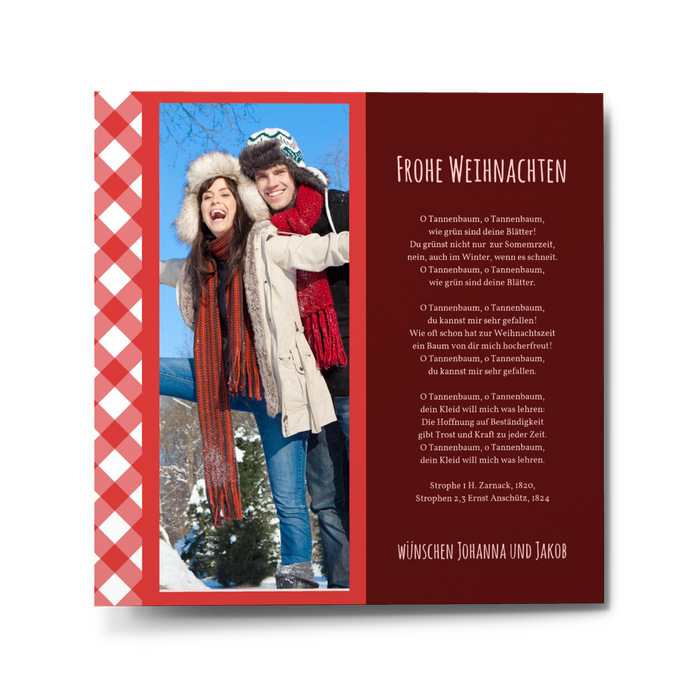 In der Farbe von Zuckerstangen erwartet diese Weihnachtskarte Ihre Fotos und lieben Wünsche an die Verwandtschaft. Die große Doppelkarte bietet genügend Raum für alle Grüße zum bevorstehenden Weihnachtsfest. Alle Freunde, die diese Karte erhalten dürfen, freuen sich sicherlich sehr darüber.