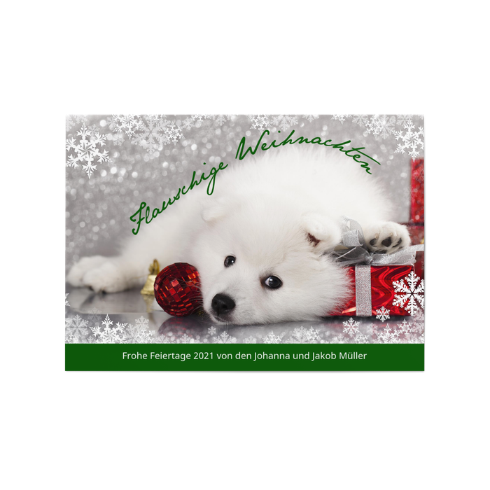 Unser tierischer Freund wünscht dieses Jahr flauschige Weihnachten! Auch in Grün ist diese Karte perfekt für alle Fans "tierischer" Weihnachten. Auch wenn nicht alle Ihrer Lieben ausgesprochene Hundefans sind: Süßer geht es wirklich nicht und unserem flauschigen Zeitgenossen zwischen Geschenkpaketen und Eiskristallen kann ganz bestimmt niemand widerstehen!