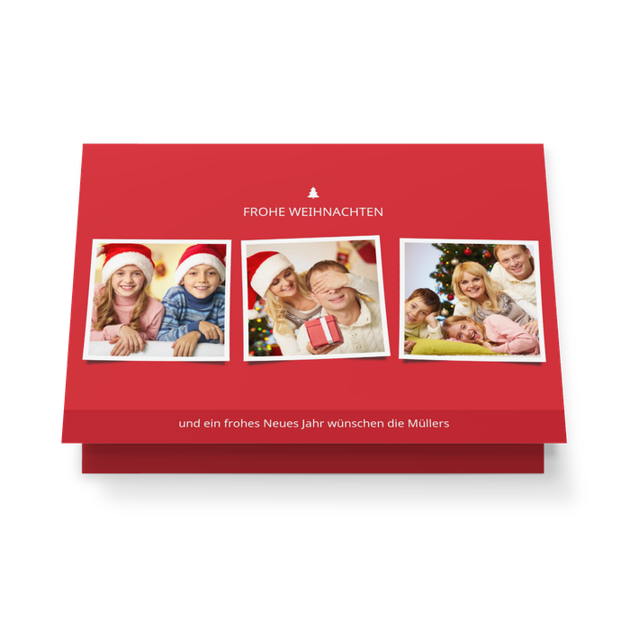 Fügen Sie zunächst Ihre Text- und Fotoauswahl in der gewünschten Weise in Ihre Kartenvorlage „Frohe Weihnachten Trilogie“ ein. Dabei steht es Ihnen frei, bereits vorhandenes Textmaterial zu verwenden oder Ihr Händchen für Worte unter Beweis zu stellen. Auch Ihr Bildmaterial stellen Sie nach Belieben zusammen. Zu guter Letzt bestimmen Sie die Rahmenbedingungen für das Format Ihrer selbst gestalteten Weihnachtsgrüße. Und fertig ist Ihre hausgemachte Trilogie von der Weihnachtskarte!